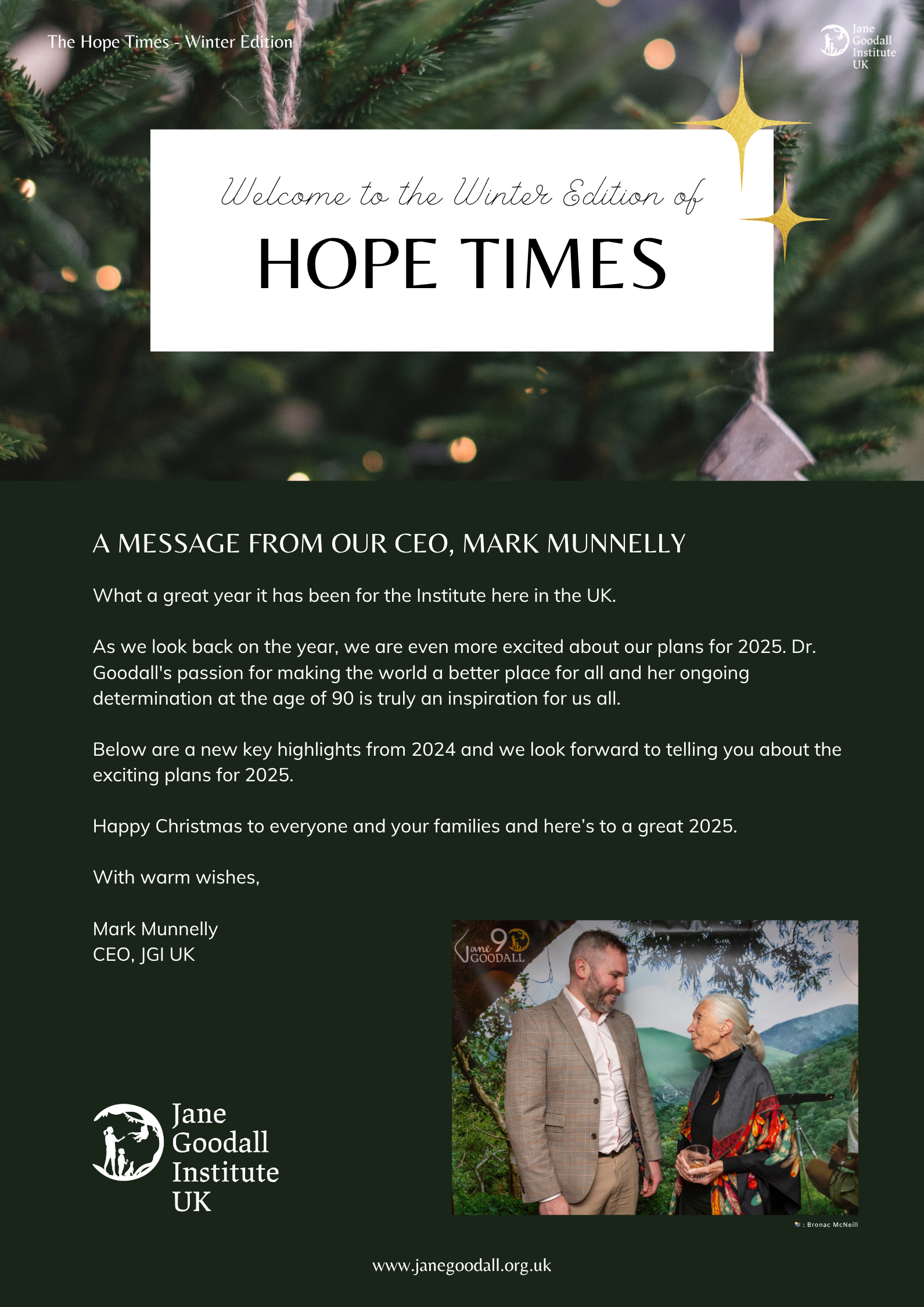 Hope Times is the official newsletter of the Jane Goodall Institute UK - a dose of optimism, action, and inspiration delivered straight to your inbox. From updates on Jane’s global work and breakthroughs in conservation to heartwarming stories from our Roots & Shoots changemakers, every issue is a reminder that hope is not passive, it’s something we create, together.